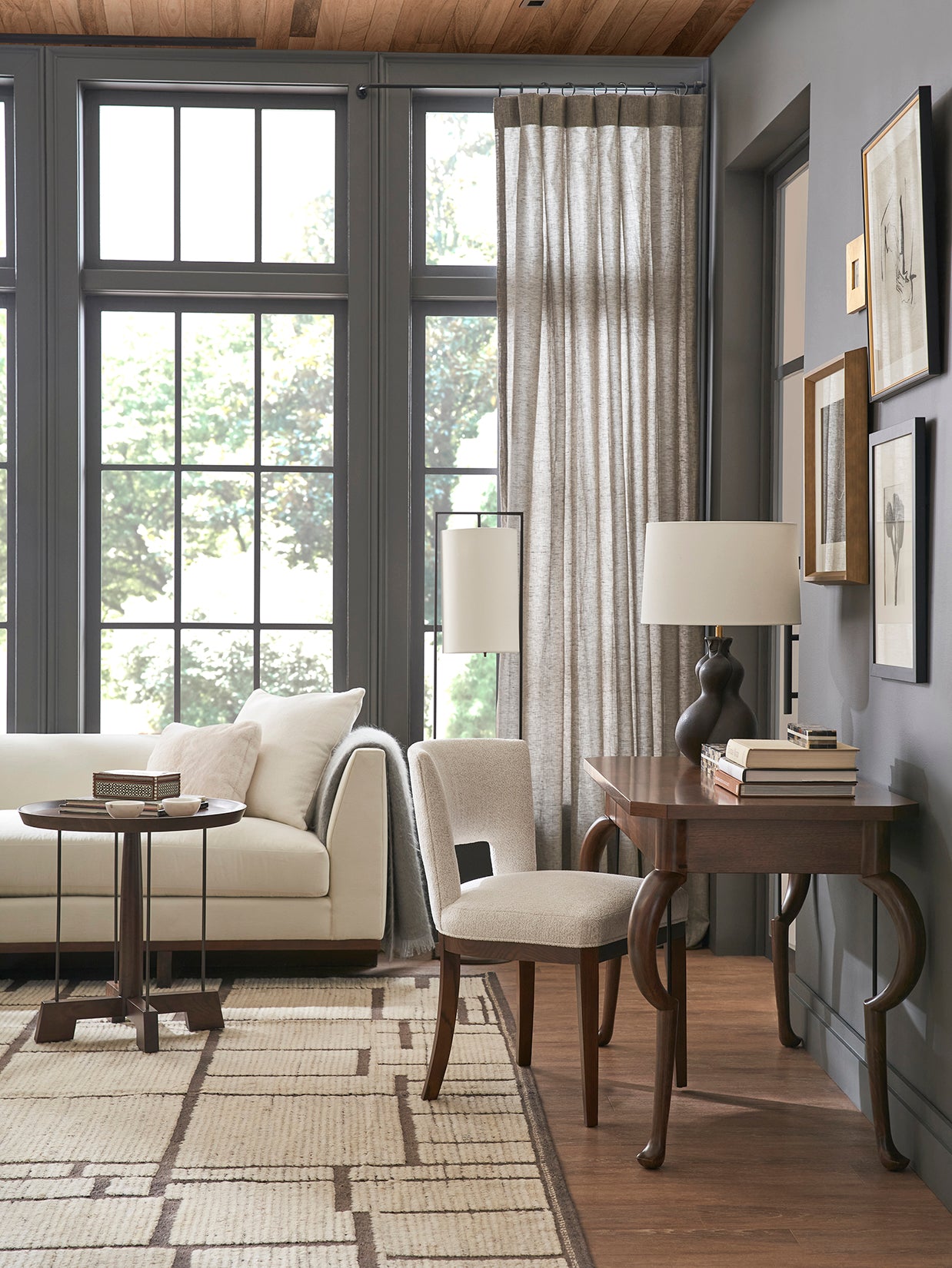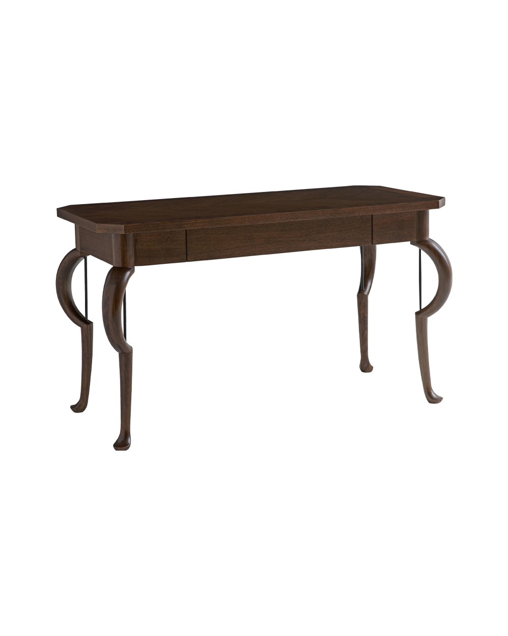 Description: “I absolutely love the Adele Writing Desk for its unexpected combination of graceful softness and the strength of steel,” says its designer, Ray Booth. “It’s a balancing act. I wanted the legs to have very fine curves, almost animated, and finished with pieds-de-biche feet. We needed the steel rod to support the delicate curves practically, but visually, it’s such a stunning juxtaposition. Crafted in American Walnut veneers and solids with Browned Steel leg posts. One drawer with Soft-Close guides. Clearance Below Drawers - 24 1/4". Optional finishes are not available on metal.