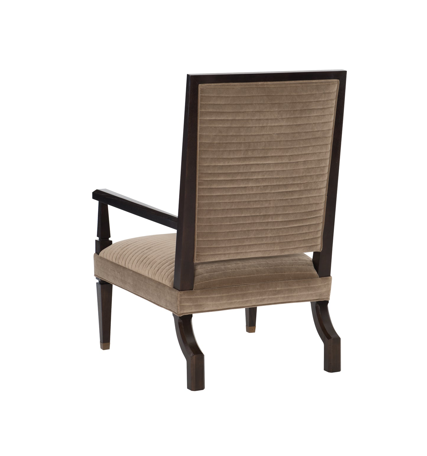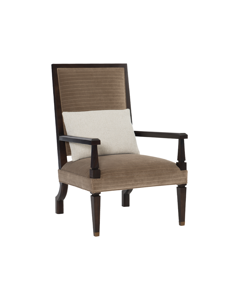 Description: The generous chair kicks back its shapely and strong rear leg. Inspired by an antique chair, the Cleft Foot Fauteuil details are refined and modernized with tapered front legs, a comfortable beveled arm, and a wide seat. The front legs terminate in antique brass ferrules for a refined, finished look.