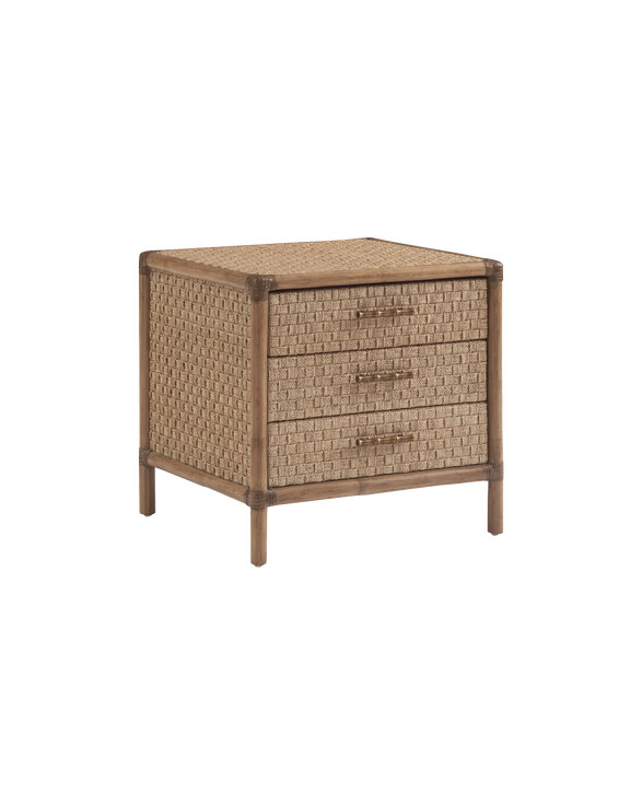 Description: The square Coral Reef end table showcases a woven pattern of braided Abaca on the top, ends and back. The frame is leather-wrapped rattan and there are three soft-close drawers for storage.