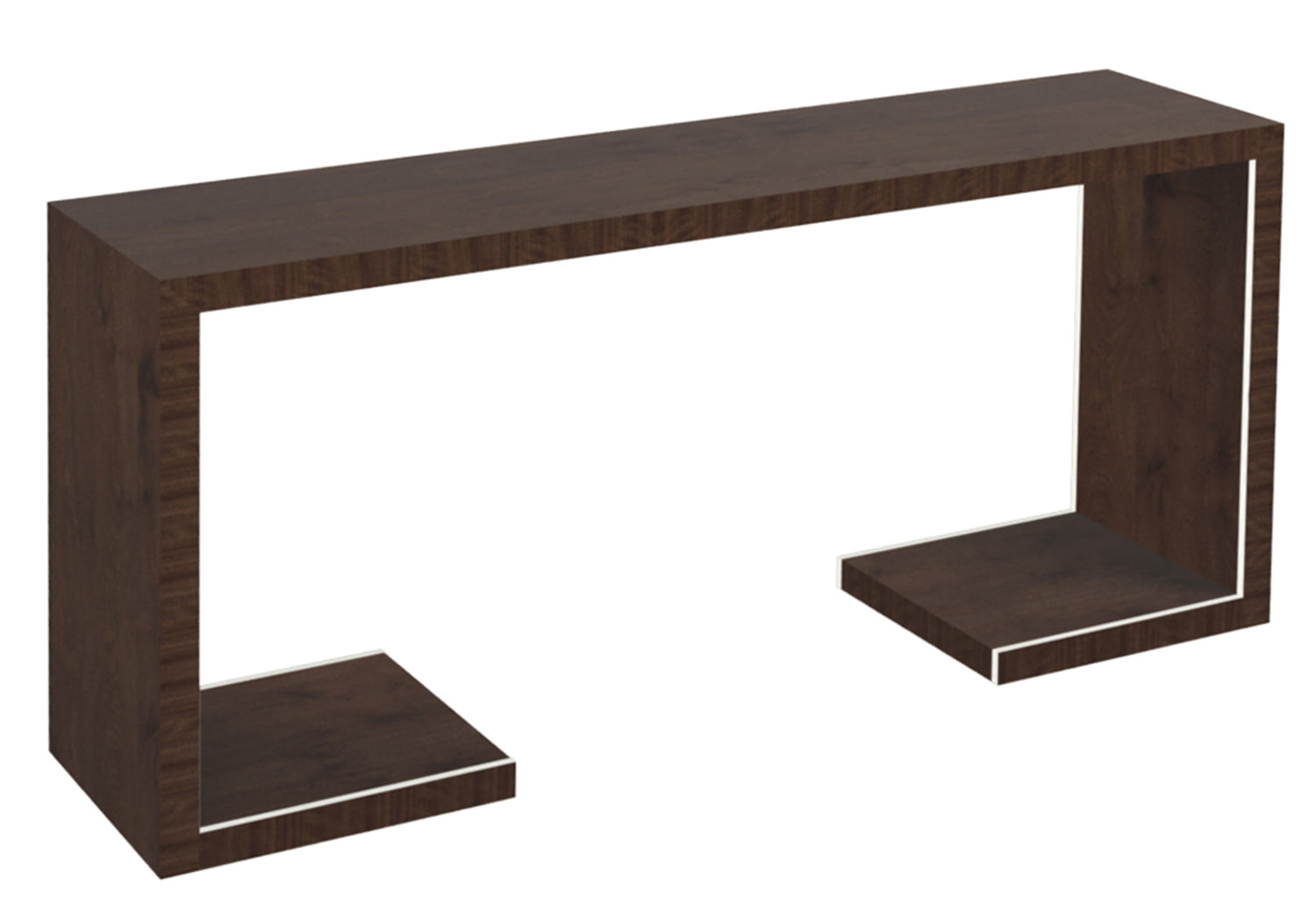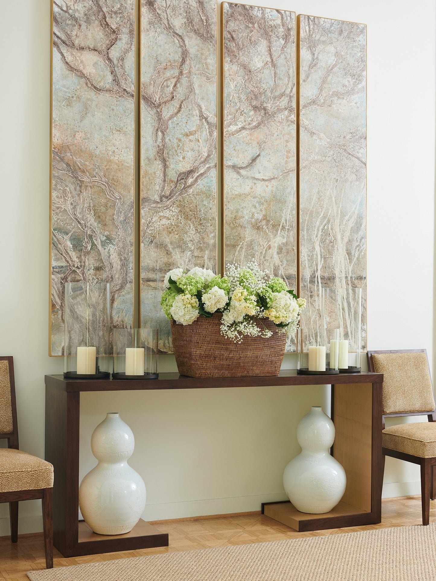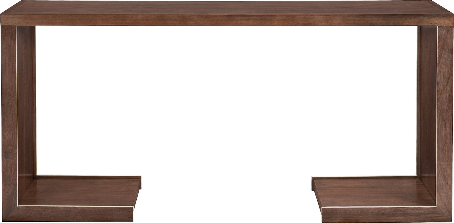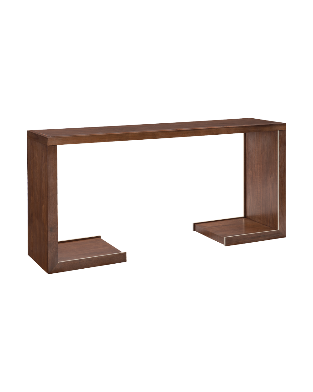 Description: The elegant simplicity of the Dennis Console creates the perfect platform for styling. The simple rectangular top sits upon a base with returns. The pair of returns allow for the placement of accessories such as a pair of urns or sculptural objects. Made from American Walnut. Optional River Rock with Solid Vanilla striping shown.