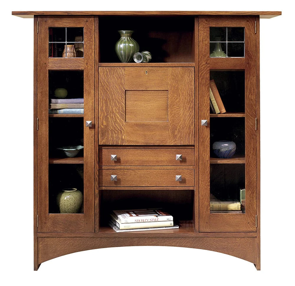 Description: Harvey Ellis Fall-Front Bookcases and Desks feature style elements that the designer would become well-known for. The gentle arch of the front apron, the exaggerated overhang of the top, and the long, delicate inlays all demonstrate Ellis' complete mastery of proportion. All versions have modern updates that include an access opening for wiring, a hidden three-outlet power strip, and a drop-down desk that's at an ideal height for typing comfortably on a laptop.