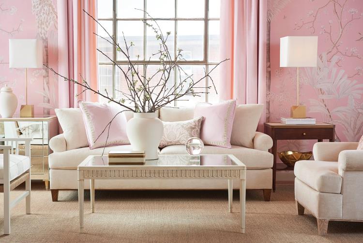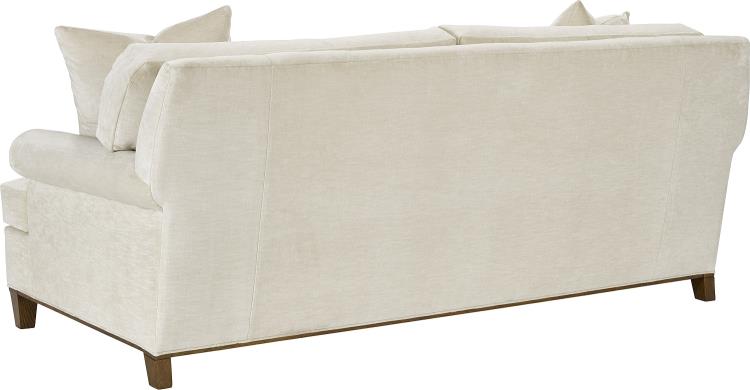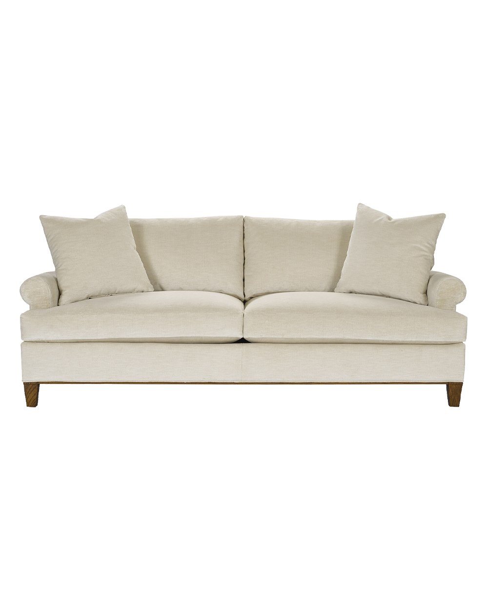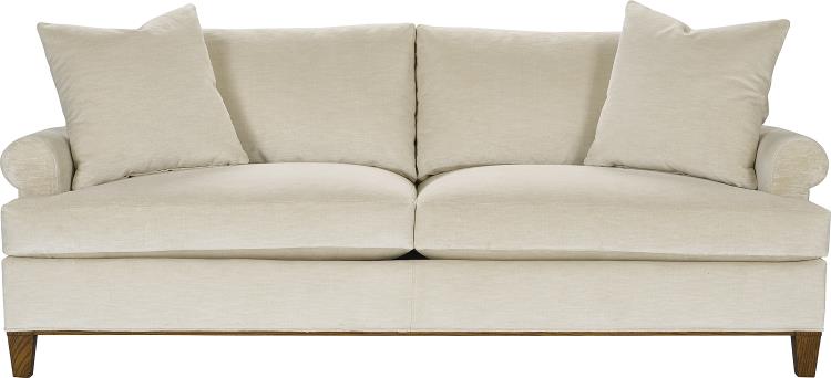 Description: The Garroux Sofa was designed by Suzanne Kasler. It has a deep-seated sock arm, two-cushion, sofa with a beautiful ash base that flows around the entire piece. The out-back has a soft shape that is carried through the back and the back cushions giving additional interest and adding a casual flair to the sofa.