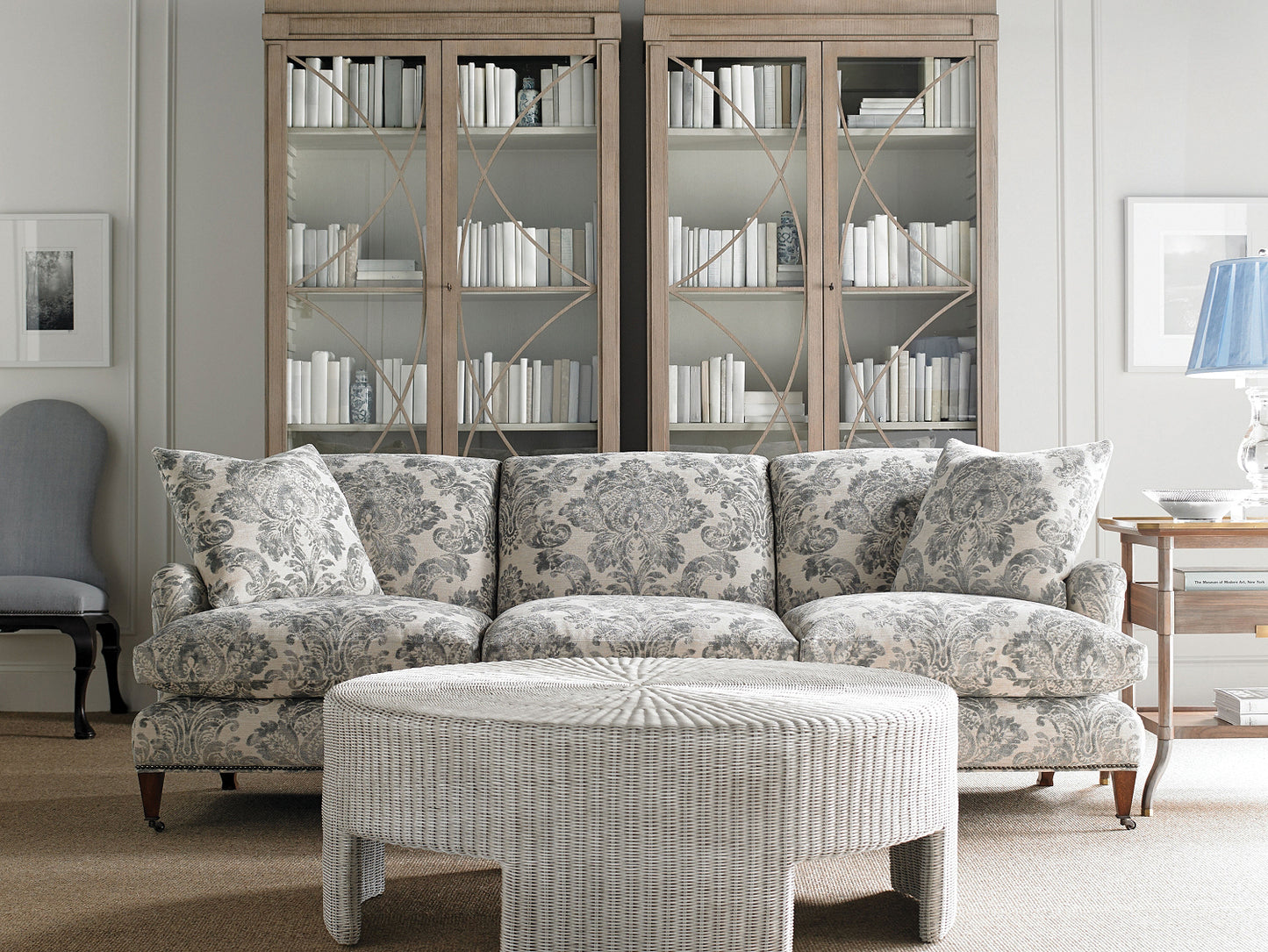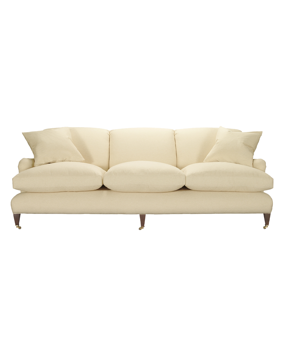 Description: The Haydon Sofa is based on traditional upholstery methods of 19th Century English upholsterers. The updated construction with low arms, high back and a wide seat was meticulously tweaked to encourage relaxation and increase comfort. Standard with a high crown, a blend of down and grey duck feather seat cushion and a down feather filled tight back help increase that comfort. The 87-inch sofa has a 2-piece seat cushion and tight back. The 95-inch sofa has a 3-piece seat cushion and tight back. The Haydon seat cushion is a custom designed cushion that is standard and only available on this series. The carved back foot and shaped front with casters and ferrules add that finishing touch and are available in Antique Bronze, Antique Brass and Antique Silver.