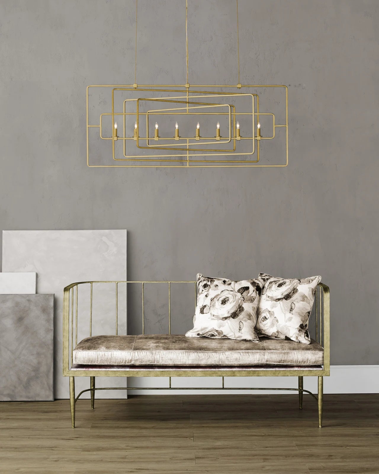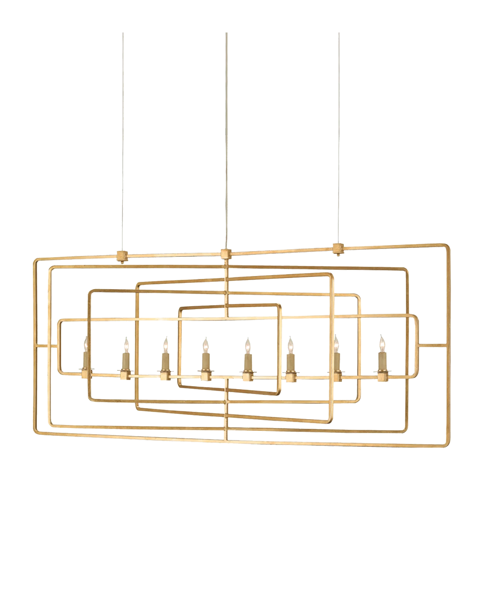 Description: Paris International Style was all the rage in the 1930s, and our contemporary new twist on it is the Metro Gold Rectangular Chandelier in a rich contemporary gold leaf finish. The elongated linear shape and the interlocking rectangles of wrought iron that form the frame of the gold chandelier salute early modernism.