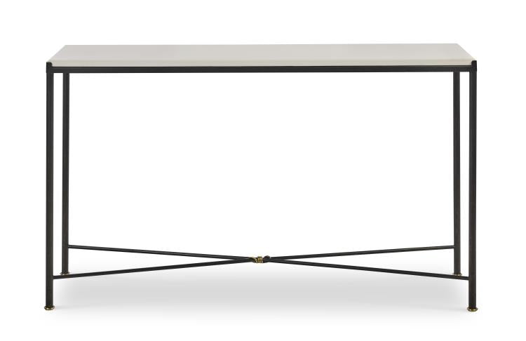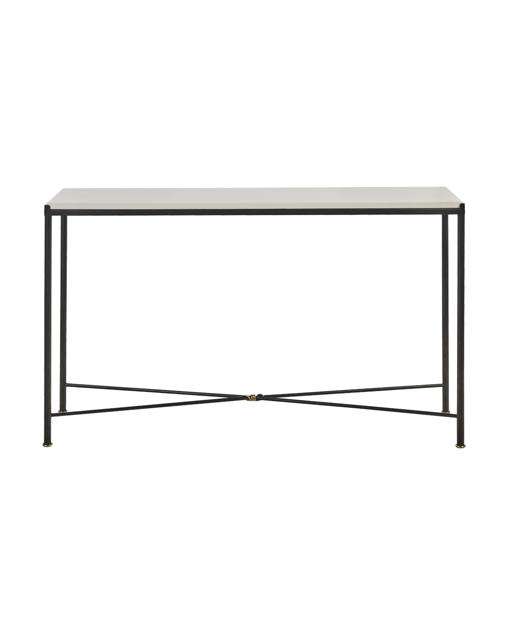 Description: The neoclassical console with a honed limestone top and brass knot detail embodies the enduring influence of neoclassical design, which originated in the 18th century and sought to revive the simplicity and elegance of of ancient Greek and Roman aesthetics. The use of limestone and brass knot detailing reflects the neoclassical emphasis on quality materials and subtle ornamentation, highlighting the blend of natural and crafted elements. This piece illustrates the continued appeal of neoclassical motifs in modern design, offering a timeless elegance that bridges historical traditions with contemporary tastes. Featuring a Greek Limestone top on a blackened iron base with Brass knot detail in 'x' stretcher and toe caps.